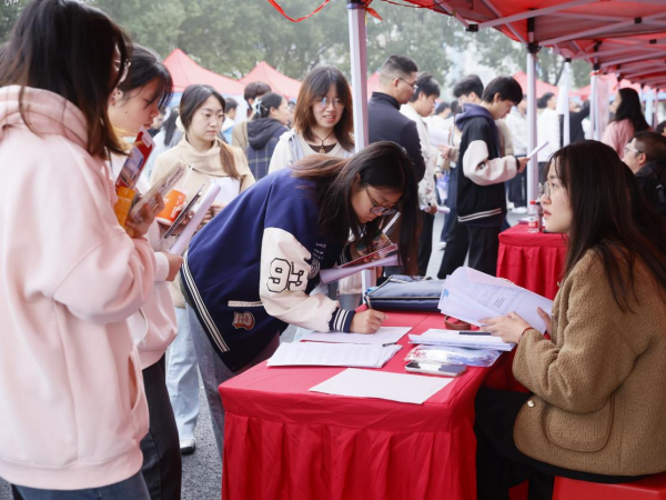 现场气氛热烈,学校就业指导中心联合市人社局设立就业服务点,提供简历优化、职业咨询与政策解读等“一站式”服务。企业展位前早早地排起长队,学生积极投递简历,咨询岗位,用人单位主动介绍企业文化与招聘需求,形成良好互动。刚刚荣获中国国际大学生创新大赛国赛金奖的校友沈俊杰,携自己创办的两家企业返回母校招聘。他从“参赛者”到“创业者”再到“招聘者”的角色转变,为在校生树立了从“学业”到“创业”再到“就业”的闭环榜样,吸引了大量毕业生驻足咨询。